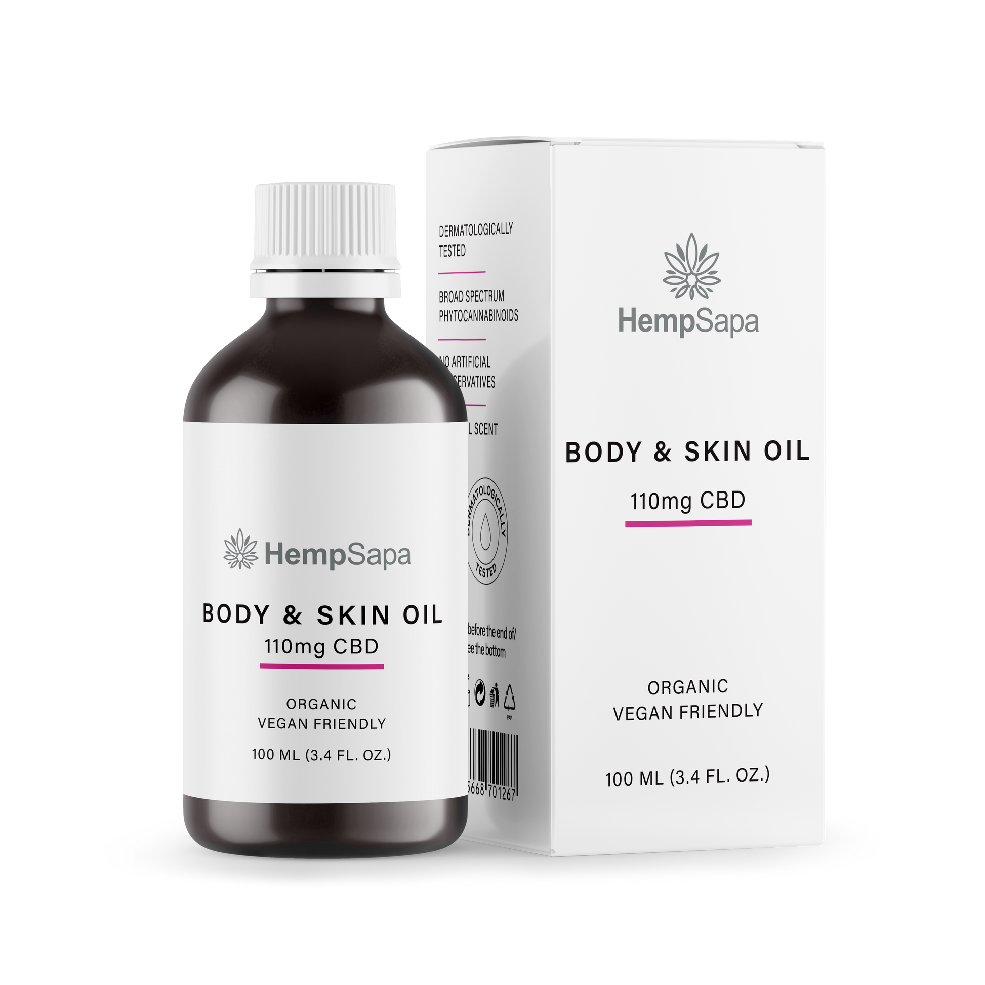Premium CBD Body & Skin Oil contains 110 mg (0.11%) of broad spectrum CBD, organic hemp seed oil, frankincense, myrrh, and hop essential oils. It helps your skin regenerate, restores skin balance and gives your skin a healthy appearance.