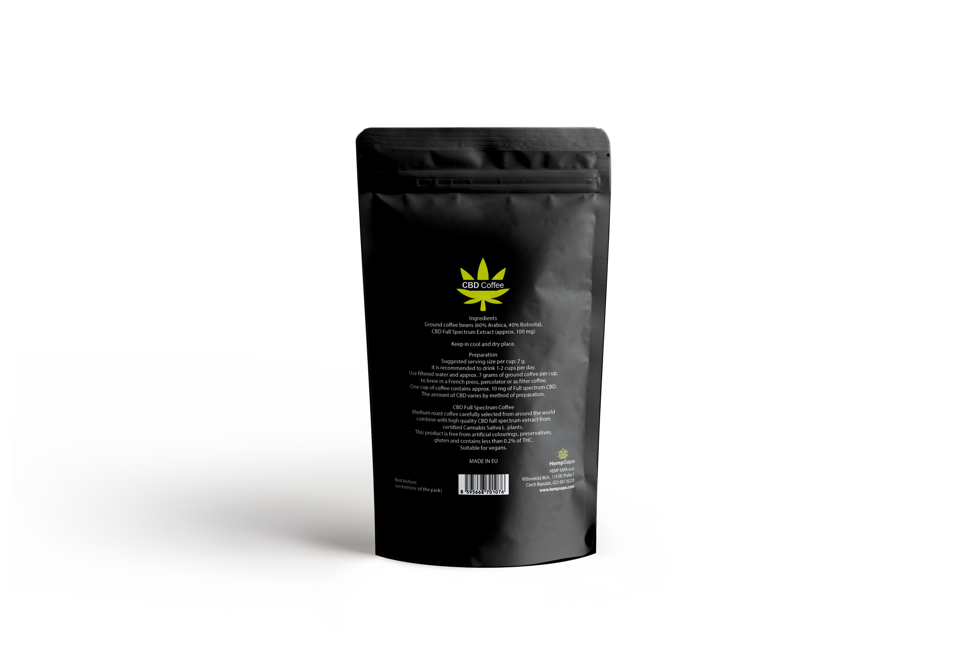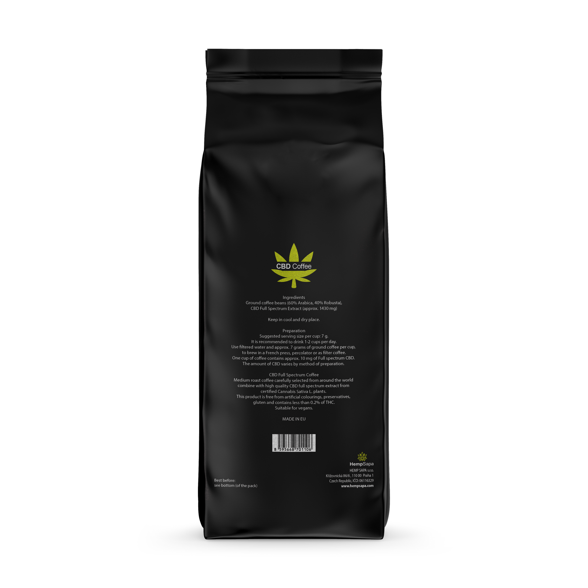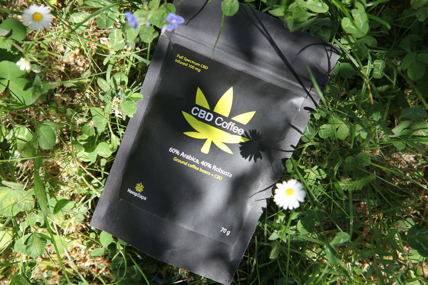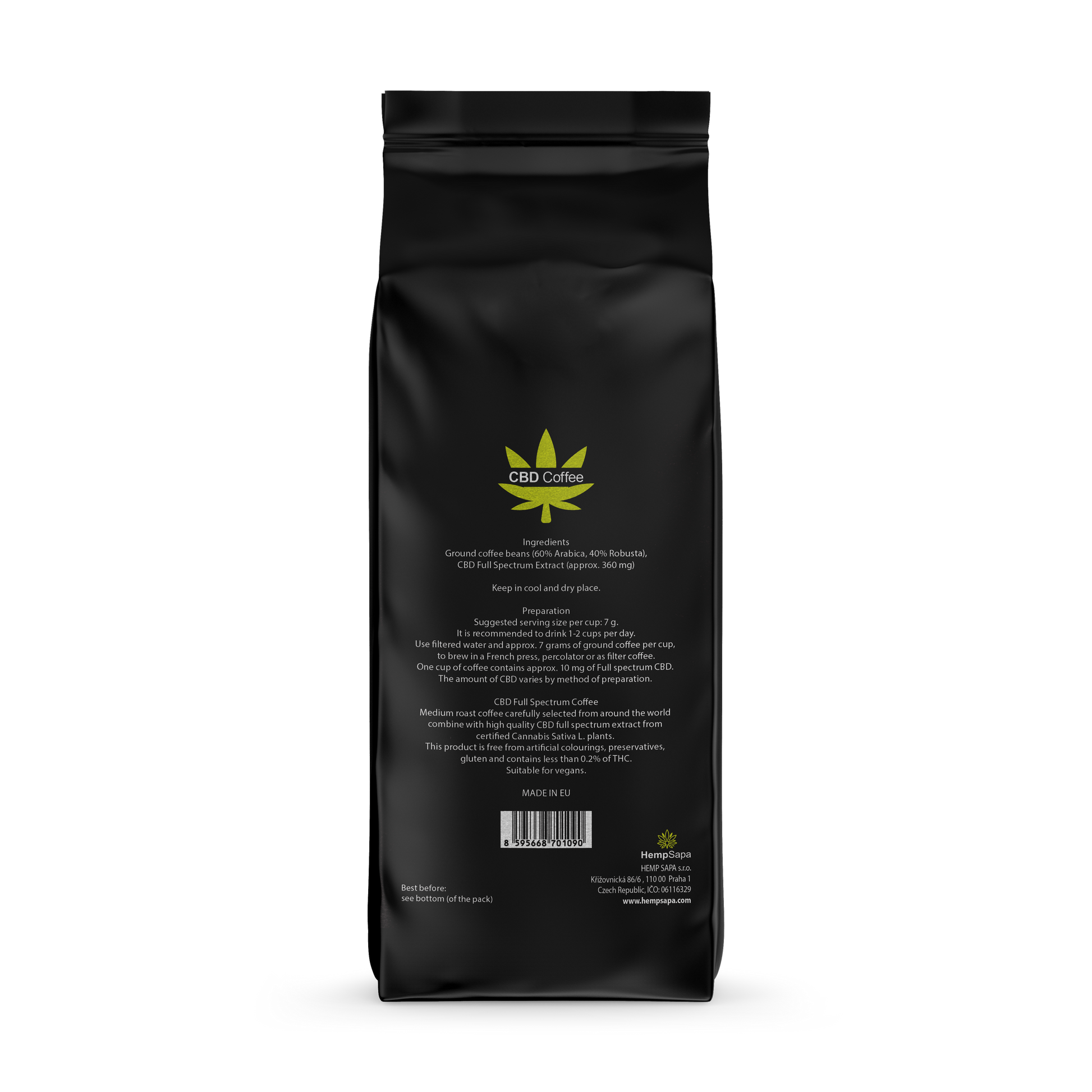 Thành phần: Hạt cà phê xay (60% Arabica, 40% Robusta), CBD chiết xuất toàn phần