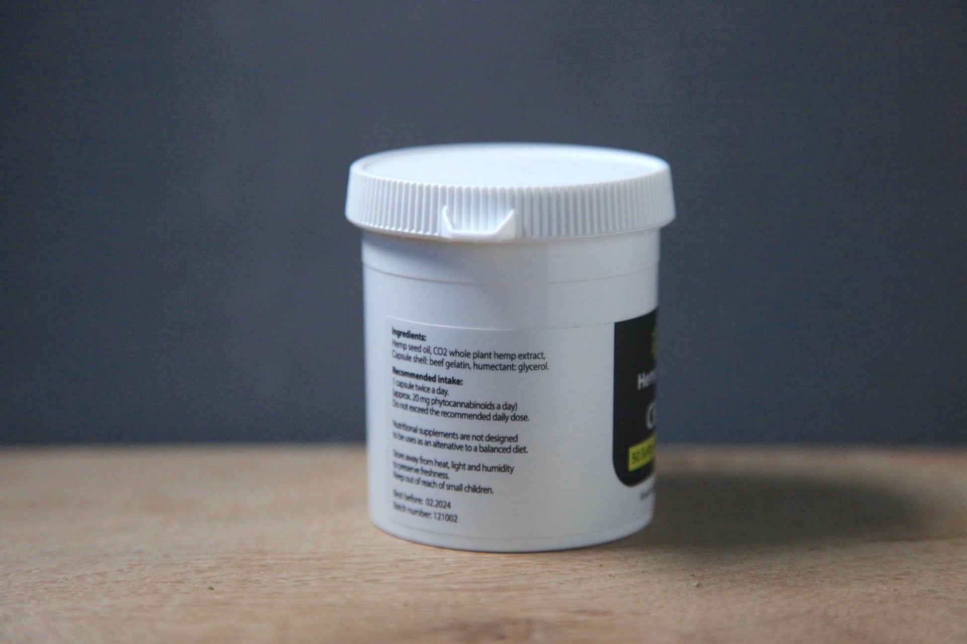 Thành phần: Dầu hạt gai dầu, chiết xuất gai dầu toàn phần bằng CO2, vỏ nang với gelatin từ da bò, chất giữ ẩm: glycerol